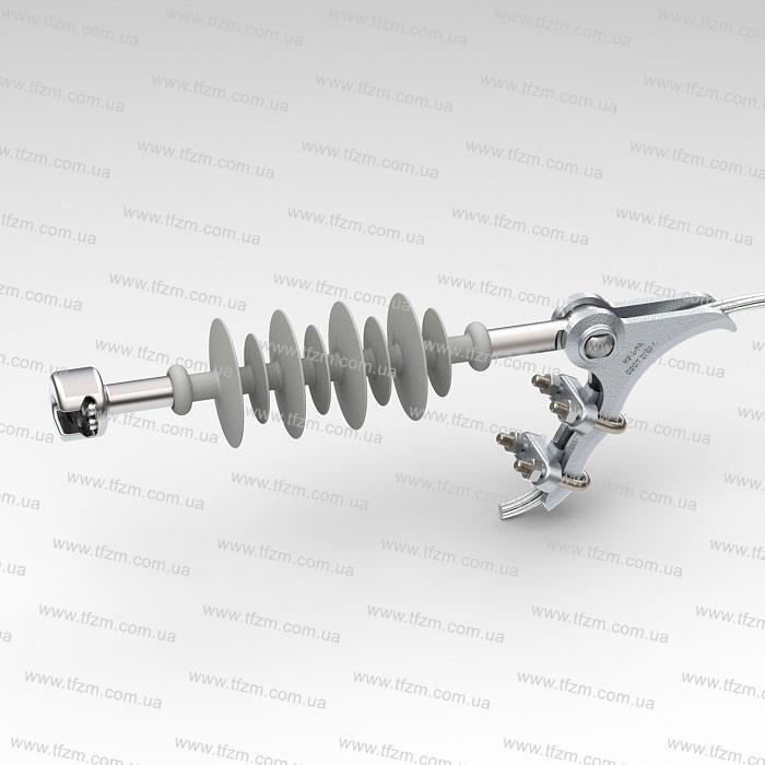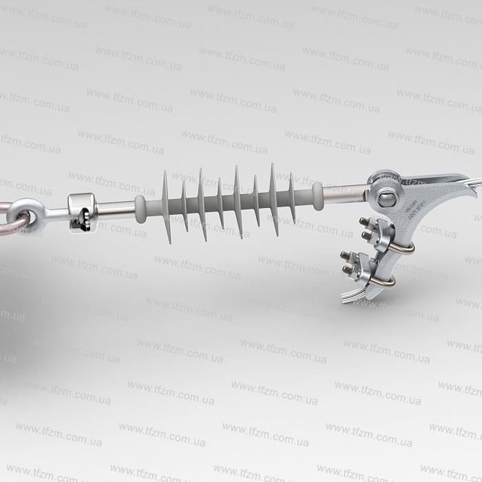 Подвеска натяжная изолирующая СЕБТ.1.10Н-5-2(50-120) на базе подвесных полимерных изоляторов ЛКЦ 70-10-5 (ЛК 70-10 IV) предназначена для присоединения голых и изолированных проводов сечением 35-50 кв. мм. к металлоконструкциям анкерных, угловых и концевых опор линий 6-10 кВ в районах с сильной степенью загрязнения.